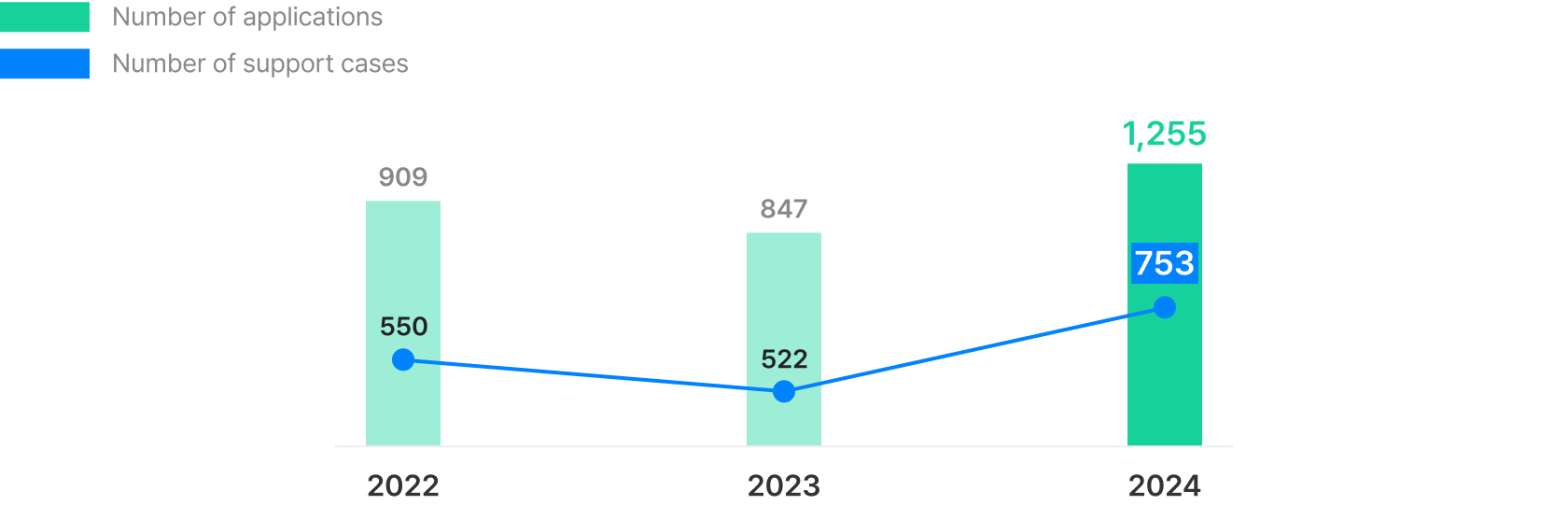Number of production / promotion applications / support cases by year